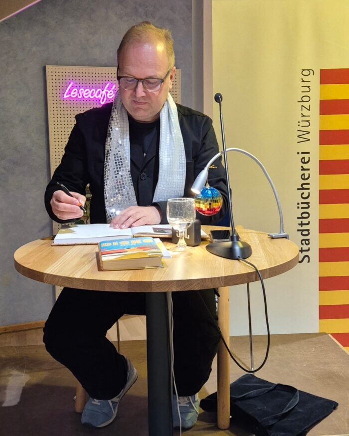 Wir hatten eine tolle und abwechslungsreiche Lesung mit Autor Till Raether. Da sein Roman “Disko” uns in das Jahr 1975 und in die Diskotheken nach München führt, wies unser Lesetisch ein paar Disko-Features auf, inkl. Glitzerschal, den Till Raether beisteuerte.