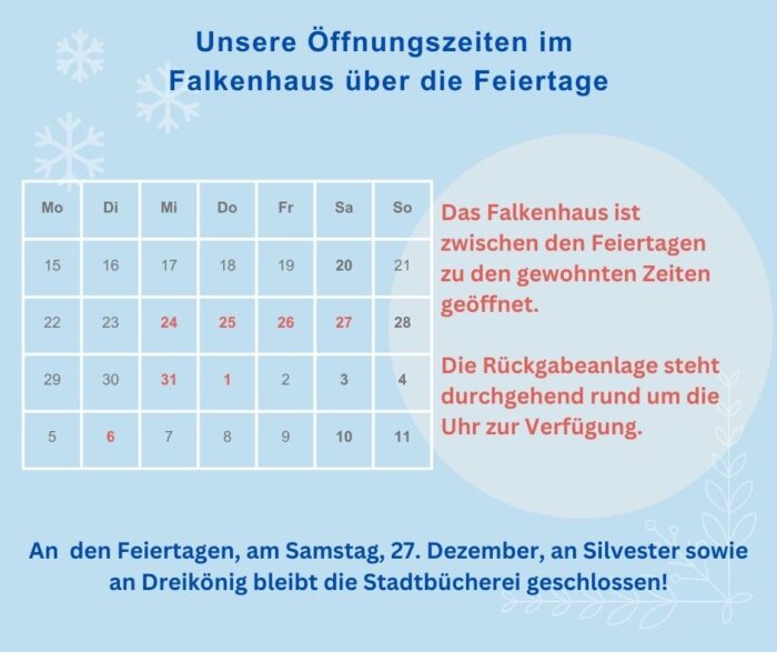 Die Stadtbücherei im Falkenhaus bleibt an den Weihnachtsfeiertagen am 24., 25. und 26. Dezember 2025 sowie an Silvester (31. Dezember), Neujahr (1. Januar) und Dreikönig (6. Januar) geschlossen. Auch zwischen den Feiertagen bleibt die Stadtbücherei dieses Jahr am Samstag, 27. Dezember, zu.